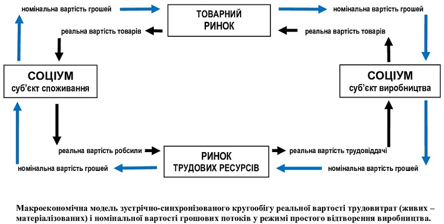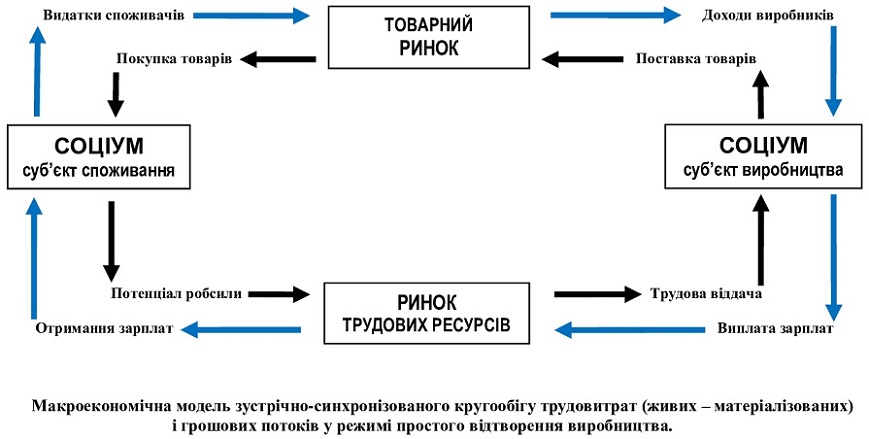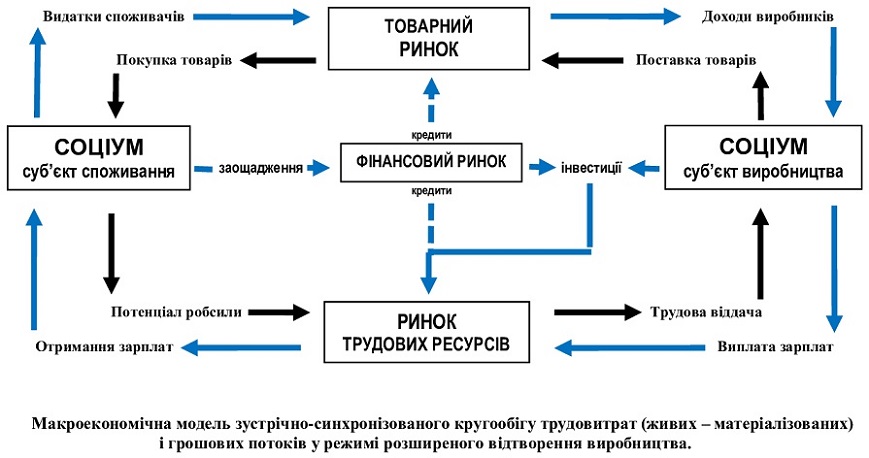 ![]() Наведена макроекономічна модель функціонування економіки демонструє зустрічно-синхронізований кругообіг трудовитрат (живих → уречевлених) та грошей між виробниками та споживачами за посередництва товарного ринку та ринку трудових ресурсів, а також інвестиційної та кредитної функції фінансового ринку в режимі розширеного відтворення виробництва. Кредити підлягають поверненню на фінансовий ринок (у банківський сектор); інвестиції безпосередньому поверненню на цей ринок не підлягають. Макроекономічна модель потребує уточнення. 1. «Виробники» та «Споживачі» – суб'єкти економічної діяльності. Виробники є одночасно і споживачами. Тобто підприємці та робітники є виробниками та споживачами матеріальних благ, однак, у різному статусі беруть участь у виробництві та користуються плодами їхньої спільної праці. Ними ж формуються інвестиційні вливання в економіку двома основними шляхами: а) безпосередня реінвестиція частини додаткової вартості у власне виробництво підприємцями; б) за посередництва фінансового ринку із доходів підприємців та заощаджень громадян у вигляді грошових вкладень у депозити, акції, облігації. 2. «Товарний ринок» і «Ринок трудових ресурсів» є обмінні товарно-грошові канали кругообігу праці: живої – уречевленої. Жива праця на «Ринку трудових ресурсів» потенційно представлена специфічним «товаром» робоча сила; уречевлену працю на «Товарному ринку» представляє виготовлений живою працею продукт в якості товару. Вартість як товарів (у ціні), так і вартість робочої сили (у зарплаті) формується одним і тим законом вартості ринкової економіки, з тією різницею, що вартість товарів формується шляхом переливу інвестиційних капіталів у виробництві до середньої норми прибутку від їх реалізації – m/c+v; вартість робочої сили формується шляхом її вільної міграції у пошуках кращої зарплати до середньої норми додаткової вартості від її експлуатації по найму – m/v. Інакше кажучи: вартість товарної продукції балансується середньою нормою прибутку в процесі торгу навколо її трудомісткості; вартість робочої сили балансується середньою нормою додаткової вартості у процесі торгу навколо її трудового потенціалу. Тобто увесь кругообіг праці (живої – уречевленої) в економіці продиктований законом трудової вартості вільноринкової економіки, а саме його фундаментальною вимогою рівновеликої вартісної віддачі від рівновеликих трудовитрат, яку реалізують гроші, приводячи в рух трудовитрати живі – уречевлені. 3. «Фінансовий ринок» включає в себе банківський сектор і фондовий ринок. Банківський сектор є ринковим каналом кредитування як «Виробників», так і «Споживачів». Кредити виробникам ідуть транзитом на «Ринок трудових ресурсів»; кредити споживачам ідуть транзитом на «Товарний ринок». «Фондовий ринок» є ринковим каналом переливу інвестиційних ресурсів від «Споживачів» до «Виробників». В даному випадку «Виробники», по суті, виконують транзитну функцію перенаправлення інвестиційних потоків на «Ринок трудових ресурсів» для мобілізації робочої сили з метою створення матеріальних та кадрових передумов розширеного відтворення виробництва. У цьому ряду «Ринок трудових ресурсів» більше, аніж просто біржа праці, а «Фінансовий ринок» за своєю глибинною суттю виконує функцію переливу трудових ресурсів, вслі
